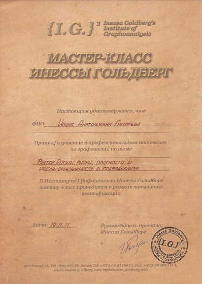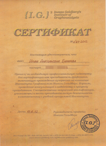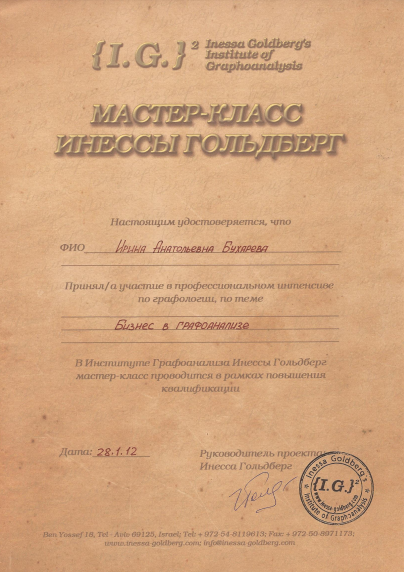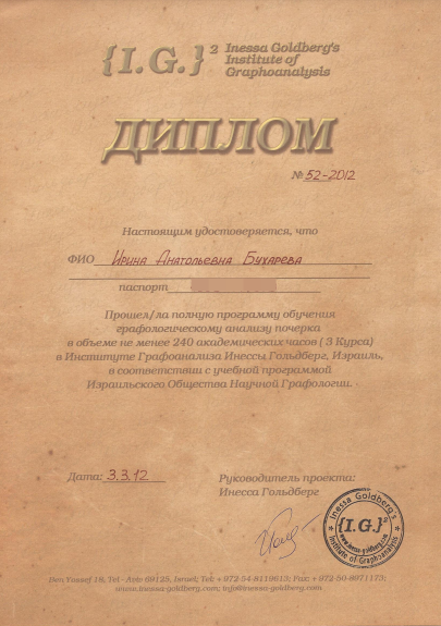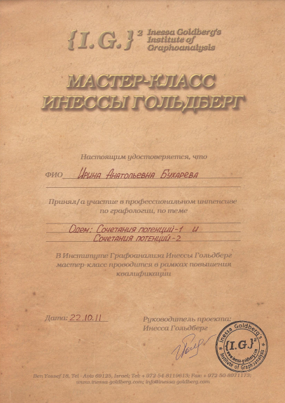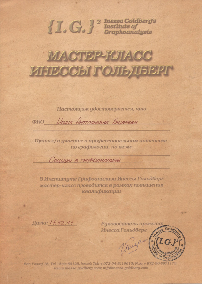 «Введение и элементы в Графологии». Сертификат удостоверяет, что Ирина Бухарева закончила виртуальный курс «Введение и элементы в Графологии», проведенный доцентом-графологом Валерией Санчес с марта по июнь 2015 г., соответствующий 120 ч