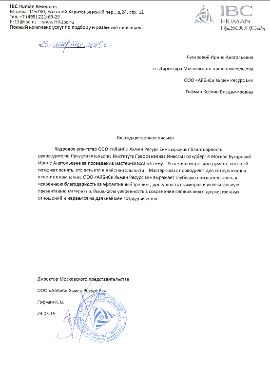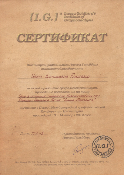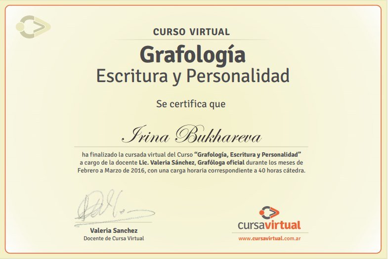 «Графология, почерк и личность». Сертификат удостоверяет, что Ирина Бухарева закончила виртуальный курс «Графология, почерк и личность», проведенный доцентом-графологом Валерией Санчес с февраля по март 2016 г., соответствующий 40 ч